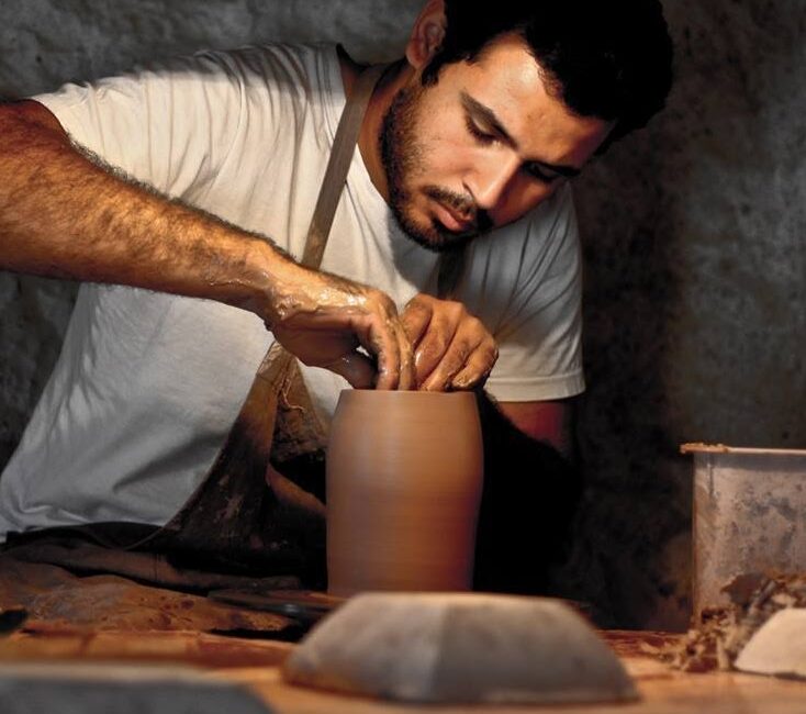 Mohamed Abouzeid grew up in Tunis village in Fayoum, Egypt, a place world renowned for its ceramics community and natural beauty. He learned the craft from his father, renowned potter Ahmed Abouzeid, from a young age, and later developed his own unique style, blending traditional Egyptian techniques with influences from Japanese ceramics. His practice combines his interests in Egyptian ceramic heritage, using locally sourced materials–like earthenware clay from Aswan or copper oxides from the Eastern Desert–with traditional techniques from around the world. Driven by experimentation and a passion to let materials guide the process, his work reflects Egypt’s diverse natural environment.